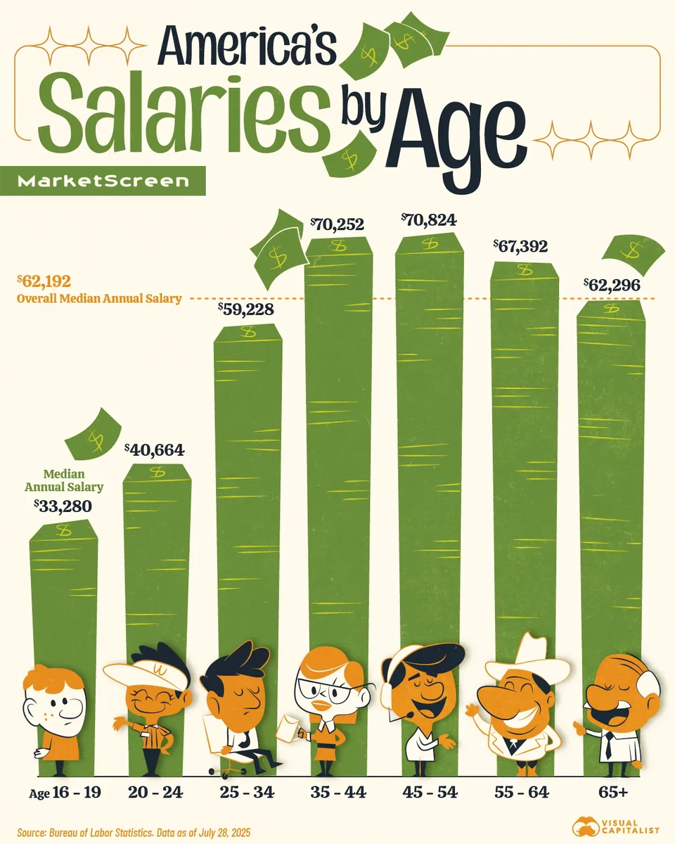График показывает медианную зарплату в различных возрастных группах по данным Бюро статистики труда. В расчёт берутся работник на полном рабочем дне. В США это получается 35 часов и более в неделю.