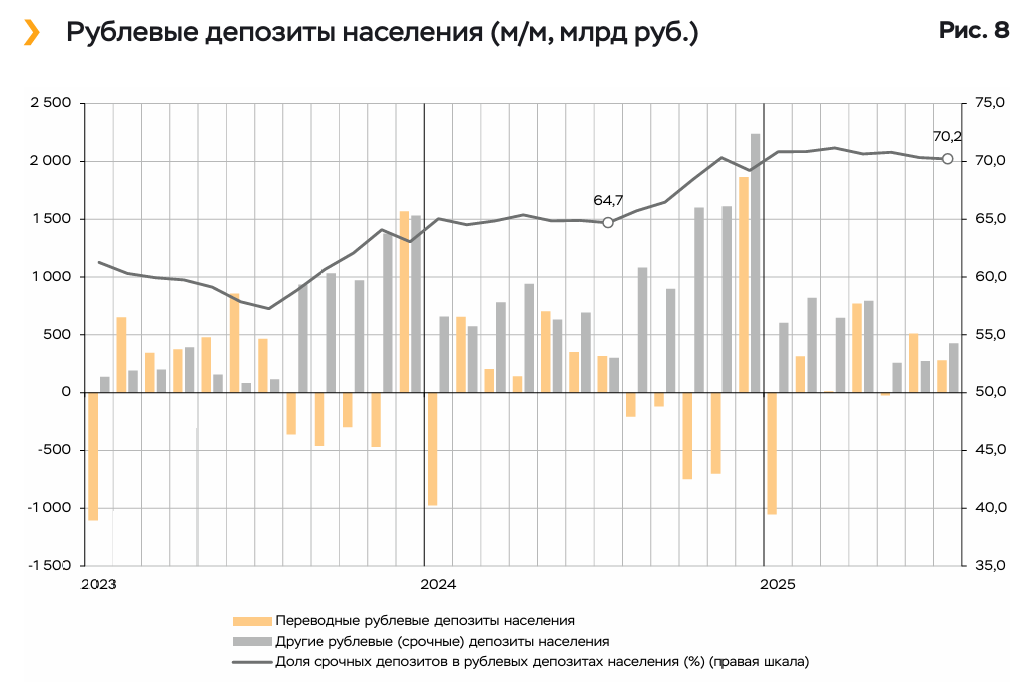 А на картинке я вам принёс динамику рублёвых депозитов населения. Как вы можете заметить, на всё видимом промежутке, в том числе и в июле 2025, продолжается приток средств на срочные депозиты, доля которых во всей массе депозитов населения остается довольно высокой – 70,2%.