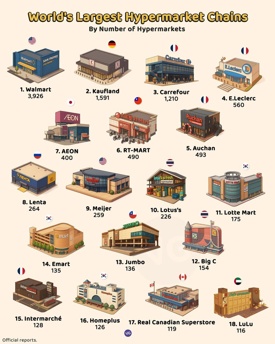 Нашёл в их интернетах рейтинг крупнейших гипермаркетов мира. Считают, собственно, по числу гипермаркетов.