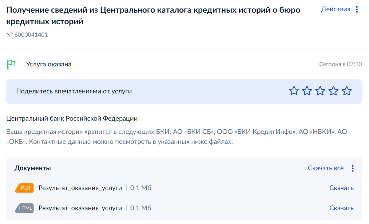 Кстати, узнать данный рейтинг и свою кредитную историю может каждый. Заходите на Госуслуги и делаете заявку на предоставление вам сведений о бюро кредитных историй, в которых хранится ваша кредитная история. Вам придет ответ (см. на картинке), открываете приложенный документ, там ссылке на каждое бюро. Далее проходите в интересующее бюро и запрашиваете нужное. 2 раза в год можно делать это бесплатно. Рекомендую. Там интересная информация. В том числе и о заявках на кредиты, отправленных от вашего имени.