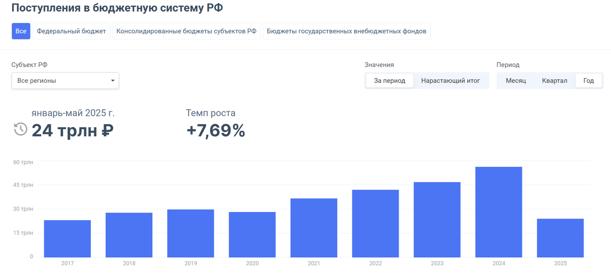 Заглянул. Подумал. Рост за 2024 год составил (разница показателей взята "на глаз", без калькулятора) 7,2 трлн руб. (+20% г/г), из них г.Москва - 1,5 трлн руб., ХМАО - 1,1 трлн руб., ЯНАО - 0,8 трлн руб., а суммарно эти три региона составляют 3,4 трлн руб. - больше чем вся остальная часть страны.