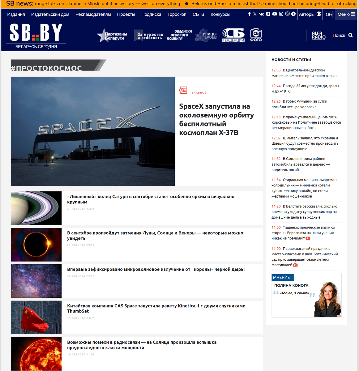 А еще у нас есть союзник и друг. Наша опора и стена от коварного Запада. Республика Белоруссия. Которая, конечно, всегда рада нашим успехам. Именно поэтому информационный ресурс «Беларусь сегодня» в профильном разделе #простокосмос» главной новостью выводит запуск SpaceX беспилотного космоплана, особенную яркость Сатурна в сентябре, запуск китайской ракеты Kinetica-1. А у друга и союзника Белоруссии России с космосом на этой неделе ничего не произошло. Ну, господи, всего лишь 145-й пуск безаварийной серии Рогозина-Борисова-Баканова. Херня какая.