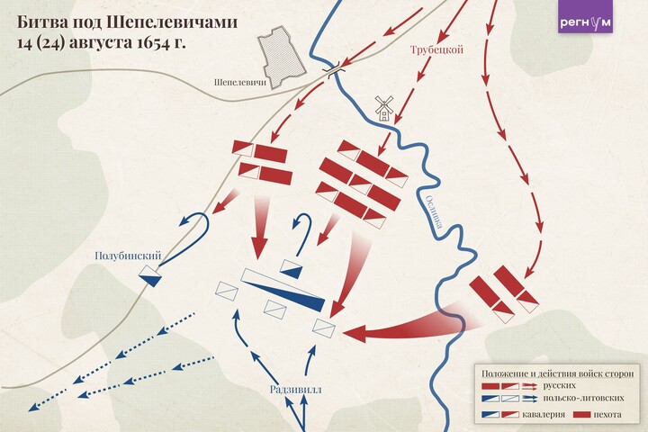 24 августа (или 14-го по старому стилю) 1654 года на поле у села Шепелевичи сошлись два войска — русское и польское. Армиями командовали представители двух известнейших фамилий. Русские полки вёл великого государя ближний боярин, князь Гедеминова дома Алексей Трубецкой. Армией Речи Посполитой командовал гетман Януш Радзивилл, из рода некоронованных королей, считавших западнорусские земли своей собственностью.