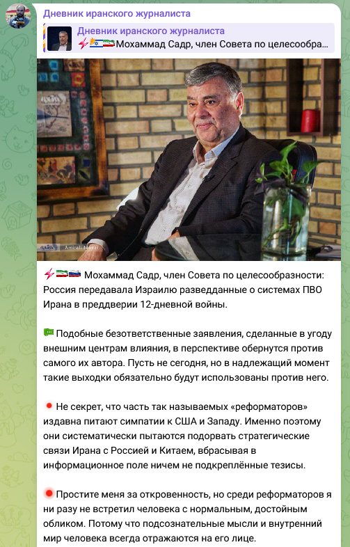 Мохаммад Садр, член этого совета, в интервью изданию «Синерджи» заявил, что во время недавней 12-дневной войны между Израилем и Исламской Республикой, а также в предыдущем конфликте, россияне передали Израилю информацию о месторасположении иранских систем ПВО.