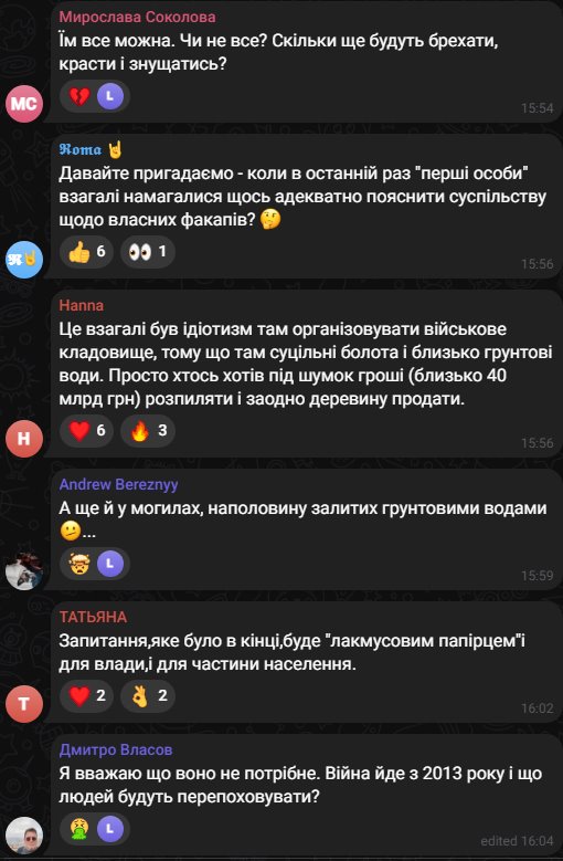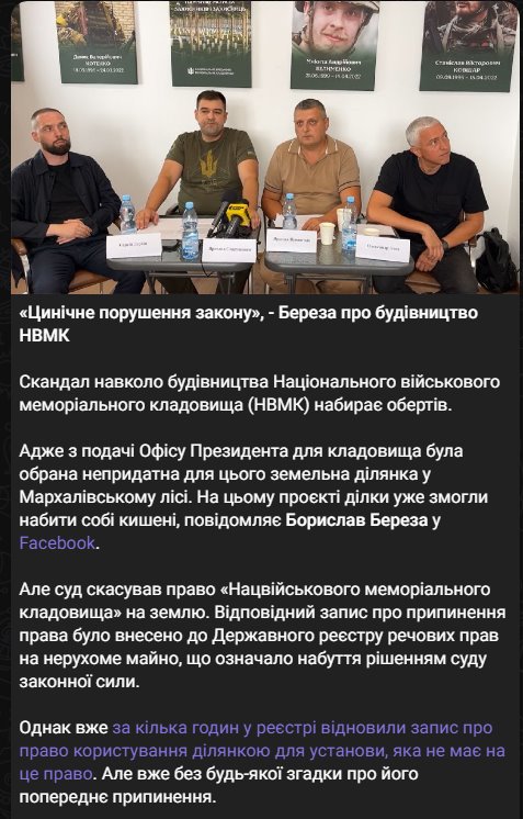 Ведь с подачи офиса Президента для кладбища был выбран непригодный для этого земельный участок в Мархаловском лесу. На этом проекте дельцы уже смогли набить себе карманы, сообщает Борислав Береза в Facebook.