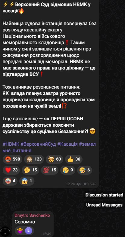 Верховный Суд отказал НВМК в кассации Высшая судебная инстанция вернула без рассмотрения кассационную жалобу Национального военного мемориального кладбища таким образом в силе остается решение об отмене распоряжения о передаче земли под мемориал. НВМК не имеет законного права на этот участок-это подтвердил ВСУ Поэтому возникает резонансный вопрос: как власти планируют завтра торжественно открывать кладбище и проводить там захоронения на чужой земле И еще важнее-как первые лица государства собираются объяснить обществу это сплошное беззаконие?