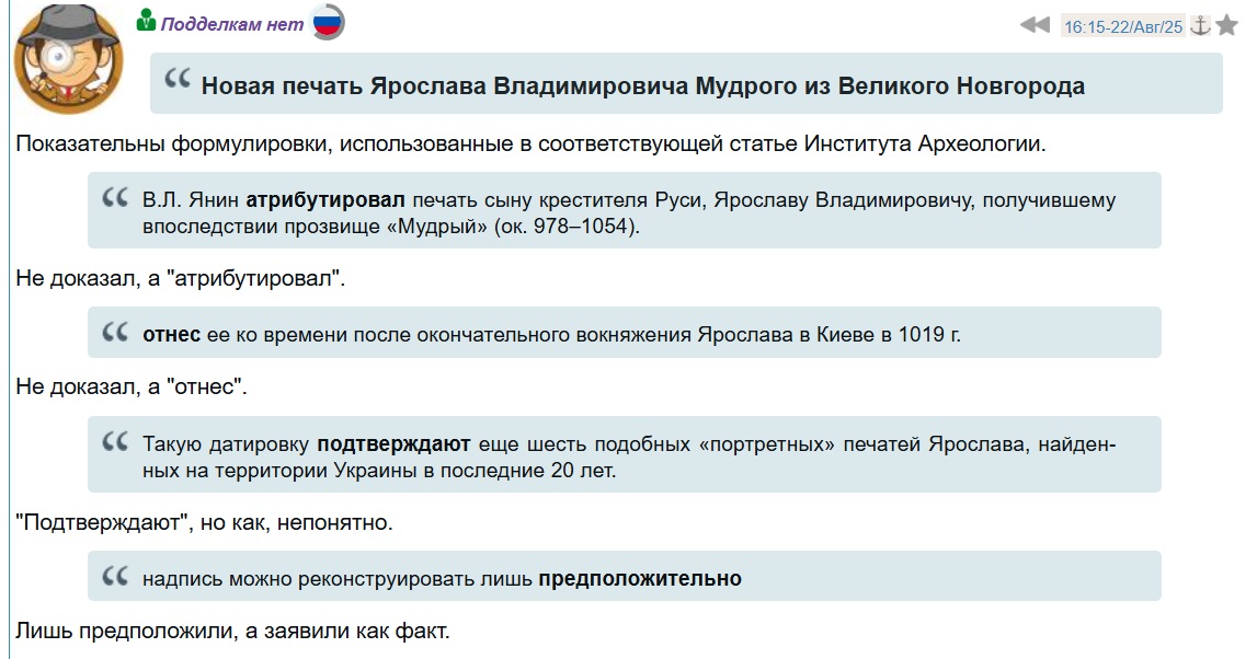 Думаю, что люди, знакомые с псевдоисторическим учением Новой Хронологии, легко узнают все эти нарративы. Да, по сути, украинские русофобы и отечественные поклонники псевдоистории представляют из себя одну группу ненавистников истории России, лишь номинально разделенную политическими границами. И печать Ярослава, найденная недавно в Великом Новгороде, это очень четко подсветила.