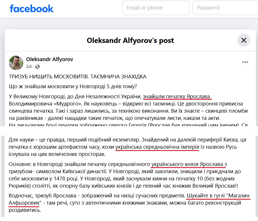 Статья, как вы видите, с громким и переможным названием – «Тризуб уничтожает московитов. Таинственная находка». Не буду приводить весь текст целиком, просто озвучу главные тезисы. 1. Новгород – город, основанный киевлянами «без жодних Рюриків». 2. Найденная печать показывает, что Новгород был конечным пунктом корреспонденции, с которой данная печать и была сорвана, т.е. «далекія периферія Києва». 4. На печати изображен тризуб «символ Київської династії». 5. Изображение усатого безбородого Святого Георгия, это образ самого князя Ярослава (если кто не понял, то это давняя украинская аллюзия на кацапские бороды, которых на Руси якобы не было). 5. Ну и конечно же фирменное финальное «А вот мой Яндекс кошелек» «Шукайте в гуглі "Магазин Алфьорових"» ибо только там вы сможете приобрести товары с «автентичними княжими знаками».