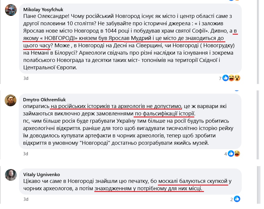 Ну а щирые украинцы, подбросили ещё стандартных перемог в комментариях к статье. Из них мы узнаем, что российские историки и археологи – фальсификаторы, печать скорее всего подделка, а нынешний Новгород на Волхове, это вовсе не тот Новгород, о котором написано в летописях, и где сидел Ярослав Мудрый.