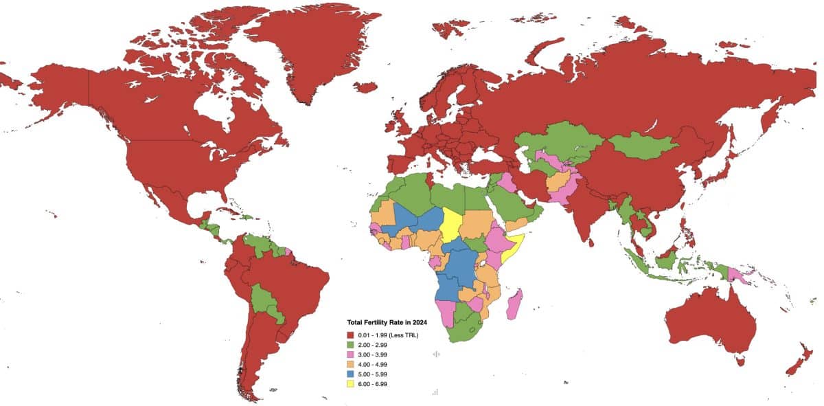 Карта наглядно показывает, в каких странах уровень рождаемости в 2024 году оказался выше, а в каких ниже уровня воспроизводства. Авторы карты взяли за ориентир два ребенка на одну женщину, но демографы считают, что устойчивый рост начинается с 2,1.