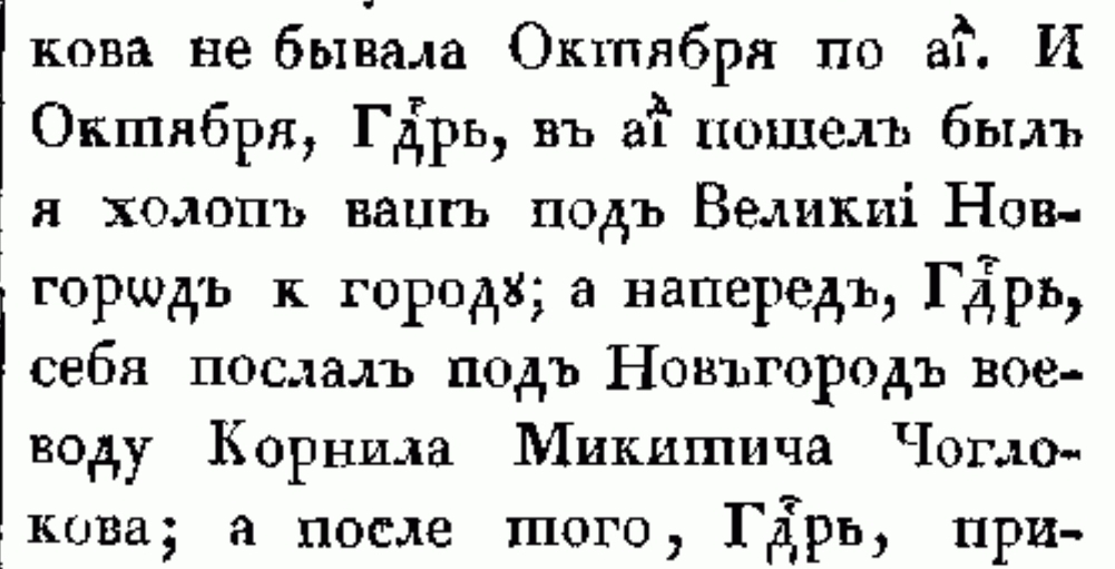 …пошелъ я холопъ вашъ на вашу Гдрву службу в Великиі Новгородъ, Сентября въ з҃ (7- п.н.) 1610 году…И Сентября, Гдрь, въ ѳî (19- п.н.) пришелъ я холопъ вашъ в Бежетцкои верхъ на Городетцко…а з Городетцка, Гдрь, язъ пошелъ в Новгородъ Сентября въ к҃ (20 – п.н.)…(4, с.453).