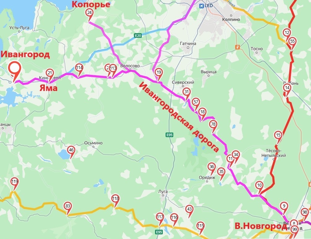 Непонятно каким образом 40 отъехавших из Новгорода в Псков детей боярских могли оказаться на Ивангородской дороге, ведущей из Новгорода в Ивангород (рис.4).