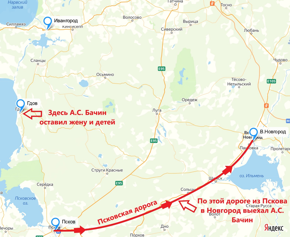 А почему вдруг Бачин, житель Гдова, не мог оставить свою семью в Гдове и ехать из Пскова в Новгород без семьи? Где сказано, что он оставил семью в Гдове именно по пути из Пскова в Новгород? Правильно, нигде. Это условие ему поставил сам автор, и это опять мошенничество.