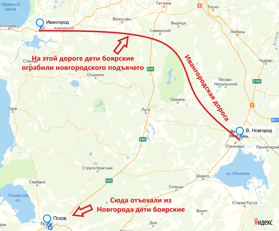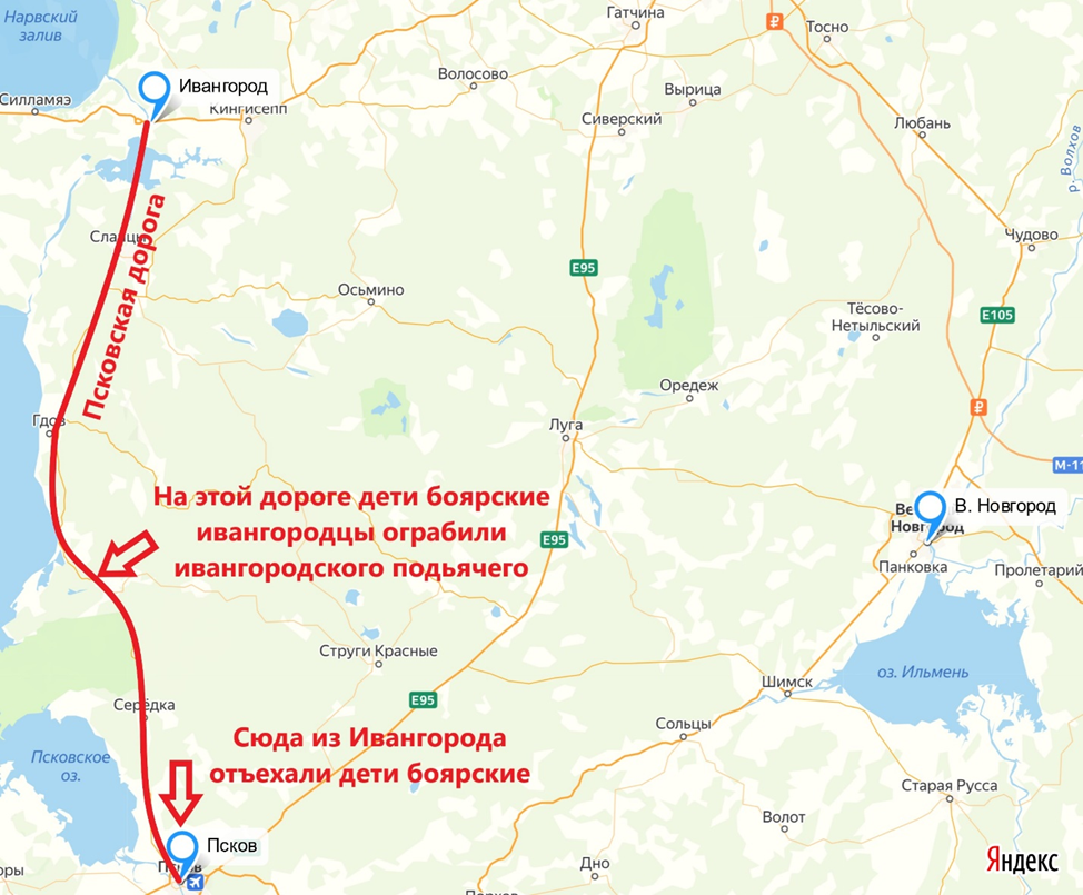 А почему отьехавшие в Псков новгродцы не могли грабить кого-то на Ивангородской дороге? Отьехавшие в Псков новгородцы могли грабить кого угодно и где угодно. Могли и на московской дороге ограбить и на рязанской. И даже в самой Москве и в самой Рязани ограбить, если бы они туда приехали и считали, что это сойдет им с рук. Для тех, кто занимается грабежом, вообще не существовало каких-то внутренних правил не позволяющих им грабить на какой-то конкретной дороге... И вообще люди, переехавшие из одного города в другой, не лишаются возможности перемещаться в пространстве и творить плохие дела вдалеке от своего нового места обитания. Так в чем же проблема? А проблема здесь снова одна - автор мошенничает. Он пытается выставить так, что эти отьехавшие новгородцы грабили именно во время своего переезда и именно по пути из Новгорода в Псков, хотя нигде про это не говорится. Да, это опять мошенничество.