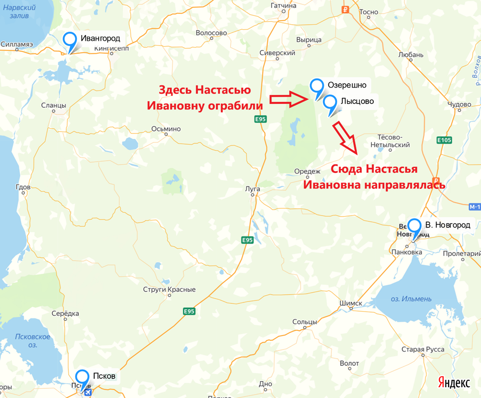 Этот случай вызвал вопрос у самого автора, т.к. непонятно каким образом Настасья Ивановна по дороге из Лысцово (деревня Лыссово, ныне несуществующая) в Новгород оказалась в Озеречно (д. Озерешно) (рис.5).