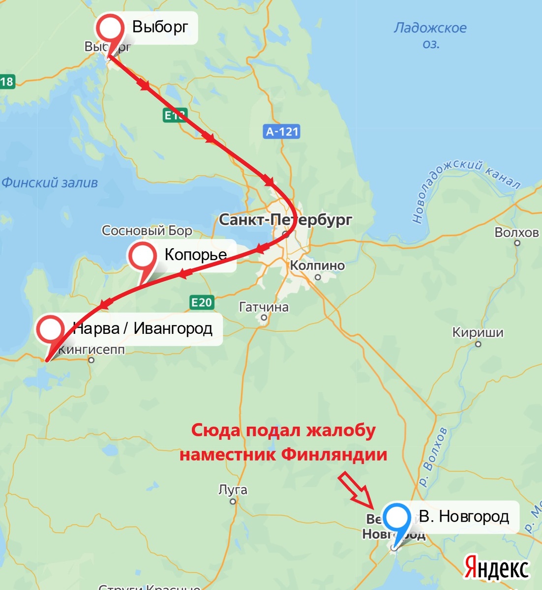Непонятно почему выборгский губернатор направил жалобу на действия Ивангородских властей не в Ивангород, а в Новгород. Причем этим же вопросом, вероятно, задался и сам Селин А.А., поставивший в тексте знак вопроса (?).
