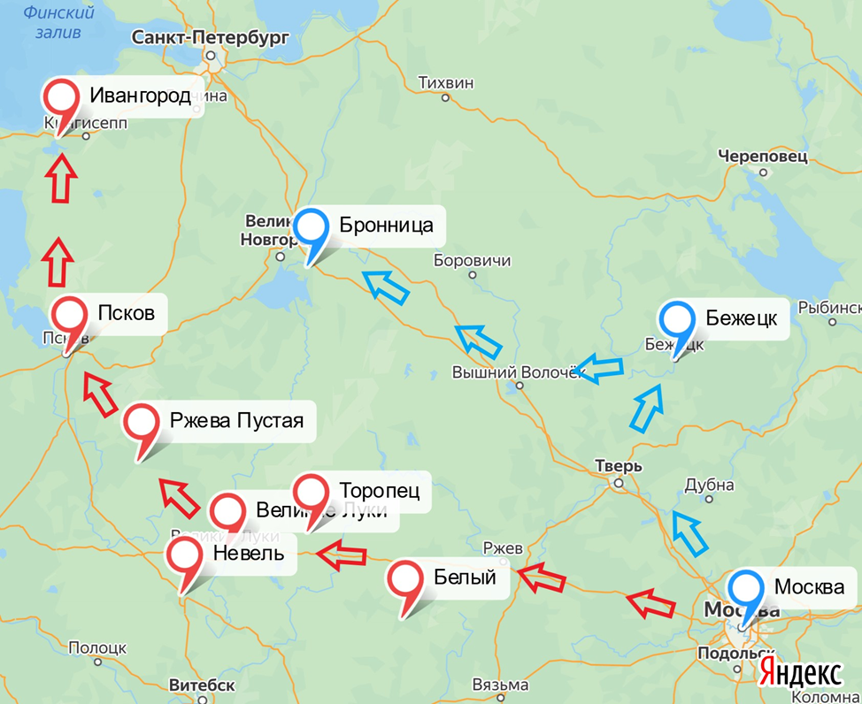 Рис.8. Маршрут Салтыкова И.М. из Москвы в Новгород согласно письменным источникам (синим) и предполагаемый маршрут И.М. Салтыкова из Москвы в Ивангород (красным)