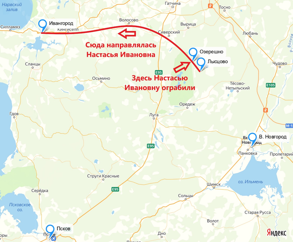 Рис.11. Предполагаемый маршрут Настасьи Ивановны, женки Обольянинова Г.С., из д. Лысцово в Ивангород и д. Озерешно, где она была ограблена.