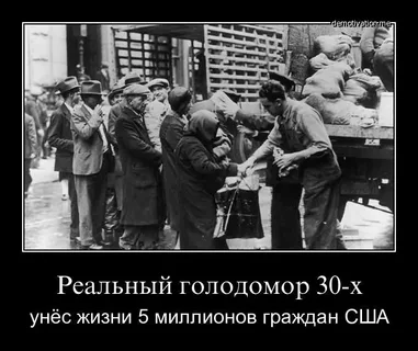 Но тут некоторые рьяные борцы с внешними и внутренними врагами решили противопоставить в пандан фуфловому советскому, социалистическому "Голодомору" всамделишный западный, капиталистический. И наиболее подходящей для этого была сочтена Великая депрессия в США. И появился на свет божий в интернет-журнале "Новые хроники" в 2008г. "труд" некоего Бориски Борисова "Голодомор по-американски" с то ли 5, то ли 7 млн. жертв [15].