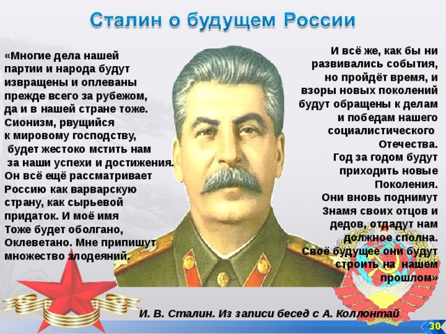 Но есть большие сомнения, что Сталин это реально говорил. Есть подозрение, что Феликс Чуев, который был выдающимся журналистом и поэтом, приводя в порядок, редактируя воспоминания маршала Голованова, что-то дописал. Есть такие большие подозрения, они высказывались разными уважаемыми людьми. Есть фальшивый дневник Александры Коллонтай, где Сталин предсказывает сионистскую угрозу. И тоже говорит о том, что нанесут кучу мусора. Это тоже фальшивка.