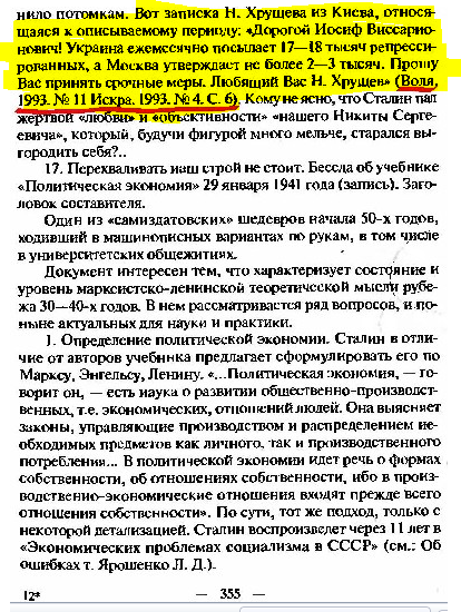 Дорогие товарищи уймисьдураковцы-любящехрущёвцы, изобретатели вашей любимой истории известны давным-давно [10]: первое прямое упоминание об этой хрущевской телеграмме Сталину содержится в книге Феликса Чуева «Сто сорок бесед с Молотовым» (М.: Терра, 1991), в сборнике Ричарда Косолапова «Слово товарищу Сталину» ( М.:Палея, 1995) упоминается уже как записка, со ссылкой на малоизвестные источники "Воля" №11 1995г. и "Искра" №4 1995г., далее в переиздании Косолапова «Слово товарищу Сталину» (М.: Алгоритм, Эксмо, 2002) снова превращается в телеграмму. И уже в 2009г. Онотоле Вассерман пишет о том, что на 10 или 12-й (опять) заявке Кукурузофила ИВС наложил известную резолюцию.