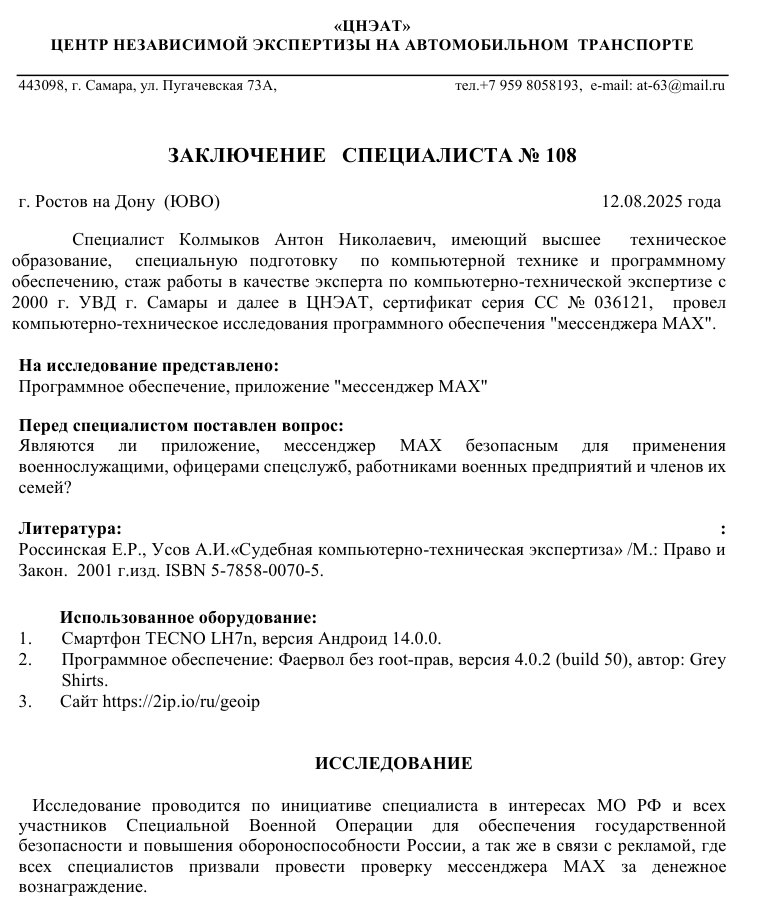 "Заключение специалиста Колмыкова А.Н. № 108 указывает, что мессенджер MAX взаимодействует с серверами, находящимися в США (Калифорния) и Чили, Сантьяго.