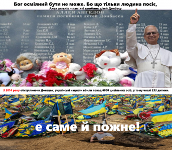 Но это ещё не всё коварство. Наши плохо умеют в информационную войну, отчего на международной арене регулярно выступают в положении оправдывающихся. Оправдывающийся слабая позиция. Сейчас мы в эту позицию поставили папу. Этот козёл, который свежеизбранный папа, в нынешнем конфликте топит за Украину и уже много чего вякал не по делу. А журналисты ему предъявят картинку и спросят как это понимать. Сделать морду кирпичом, мол, "я такого не говорил", у него не получится, ибо там цитата из Нового Завета. А значит будет оправдываться - мямлить, что с одной стороны так, а с другой этак. Вот и пусть мямлит - ложечки найдутся, осадочек останется, а другой раз будет думать прежде, чем что-то вякнуть. Неплохо, передавая картинку иностранному адресату, закосить под дурака - сказать, мол, папа молодец - понимает жисть.
