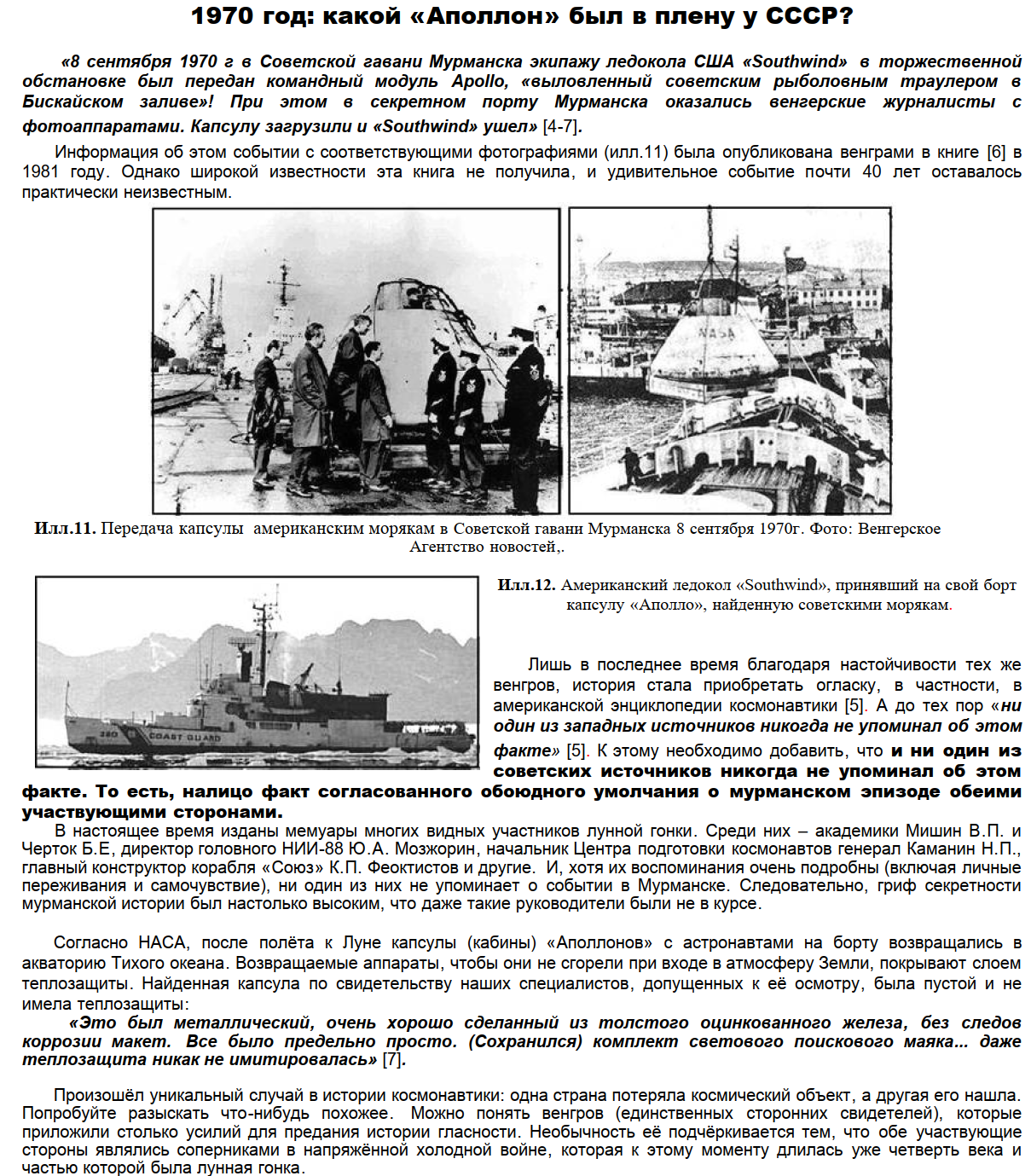Примерно через пять месяцев после запуска "Аполлона-13" в апреле 1970 года ТАСС (официальное советское информационное агентство) и американские СМИ опубликовали сообщения, утверждающие, что Советы извлекли командный модуль Аполлона, который плавал в Бискайском заливе у берегов Франции. Более конкретно, утверждалось, что это был макет командного модуля с идентификационным номером BP-1227. Болванки (макеты) командных модулей (CM boilerplates) использовались в тестовых целях и для обучения астронавтов вместо функционального командного модуля (КМ). В конце концов русские передали болванку КМ кораблю береговой охраны Соединенных Штатов." https://dzen.ru/a/ZNDdrouelDR3dtrb