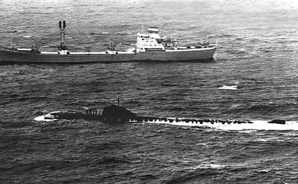 Фото К-8 предположительно с борта разведывательного самолёта "Орион". Лодка и сухогруз в дрейфе, лодка имеет небольшой дифферент на корму.