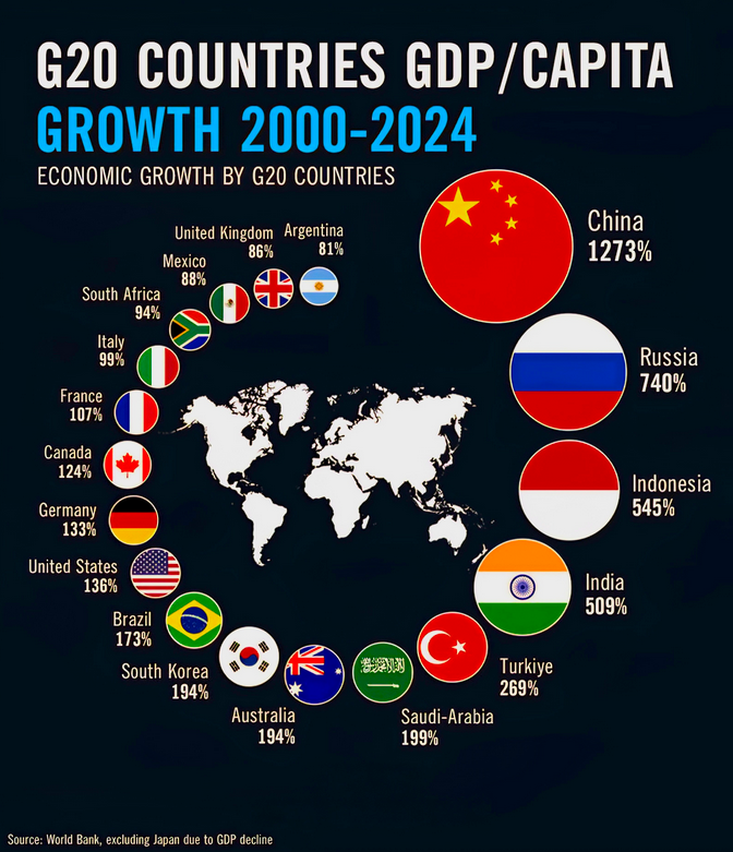 Что удивительно в двадцатке ныне 21 страна, на картинке не стали вставлять Японию ЕС, и АС (Африканский Союз), который попал в двадцатку с 2023 года. Последние две потому что их составляющие и так есть. Ну а Японию из за отрицательного роста за 25 лет, по методике в картинке, подсчитать невозможно. Конечно вышло смешно. Приписать про Японию пришлось, а объяснить почему , нет