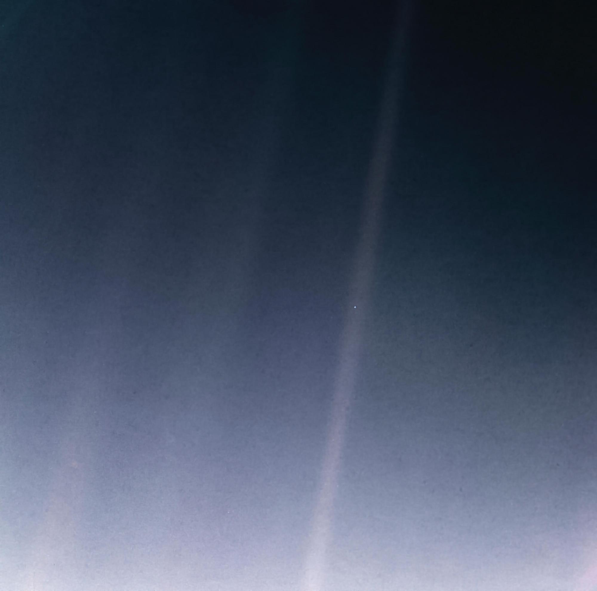 В феврале 1990 года аппарат долетел до окраины Солнечной системы, на расстояние около 6 миллиардов км от Земли. По инициативе астрофизика Карла Сагана (он попросил своих знакомых из НАСА развернуть камеры аппарата к Земле) была сделана нижеследующая фотография, которая стала одним из последних изображений, переданных аппаратом перед отключением его камер для экономии энергии (здесь она чуток обработана, для пущей выразительности).
