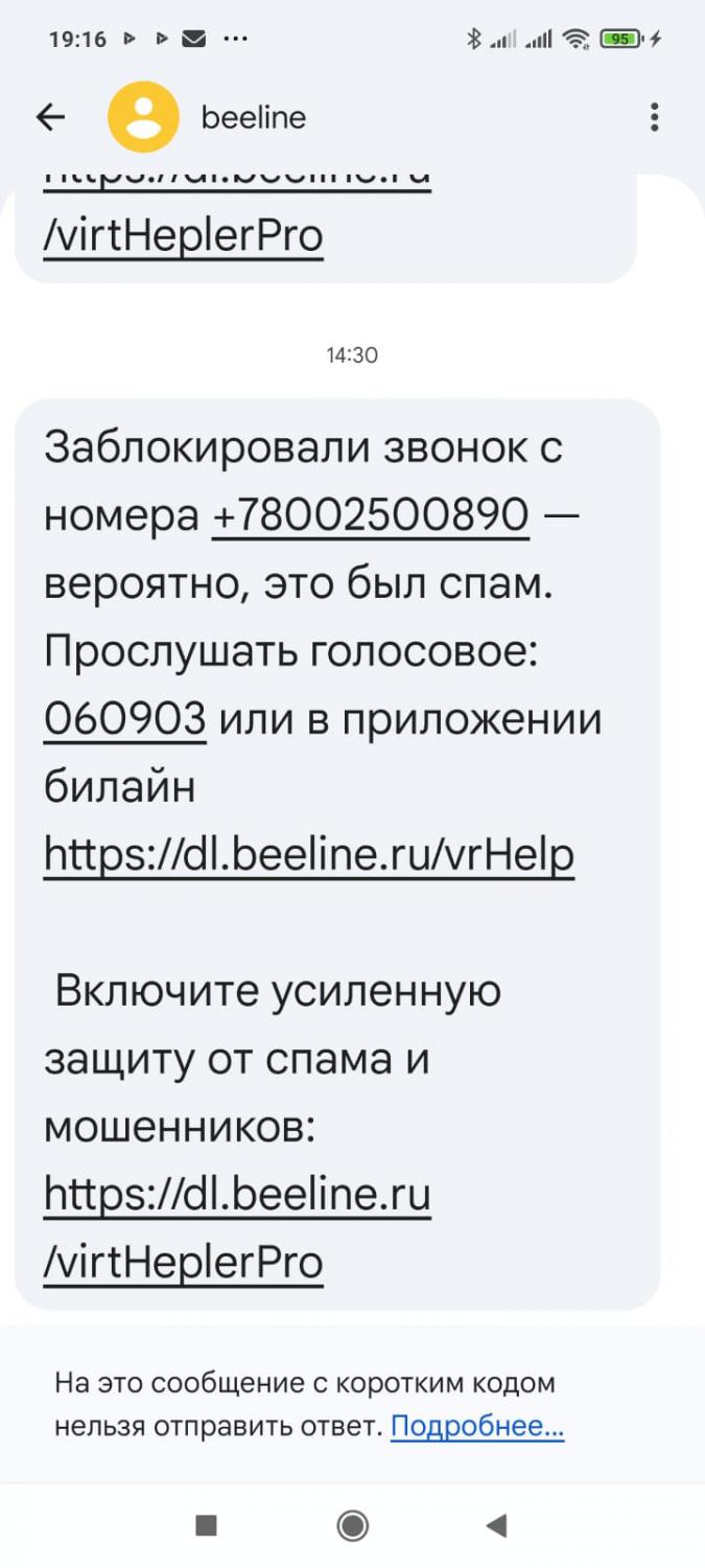 Сейчас разбираюсь с компанией МТС . Ошибся и случайно перечислил деньги на старый договор за интернет, который был закрыт 10 лет назад. Мобильный у меня Билайн, с которого и общаюсь с МТС. И вот какая хрень- мне звонят с официального номера МТС (возможно для решения вопроса о возврате денег), а мой Билайн блокирует звонок. Скрин прилагаю. Этот номер у меня в контактах, но Билайн всё равно блокирует. Пробовал снять блокировку через #35#пароль, но выдает ошибку. Дозвониться до любого живого человека сейчас практически невозможно ни к кому из операторов. Завтра схожу в офис Билайна, благо они пока есть сейчас, попробую отключить эту спам защиту.