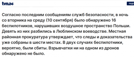- Прокуратура обнаружила останки 16 БПЛА, из них 2 было сбито. Ни в одном БПЛА не обнаружено следов взрывчатки. (скрины с польского сайта)
