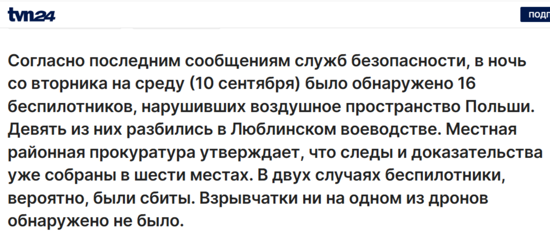 Сейчас, исходя из заявлений польского премьер-министра Туска мы знаем, что на территорию страны залетело 19 БПЛА.