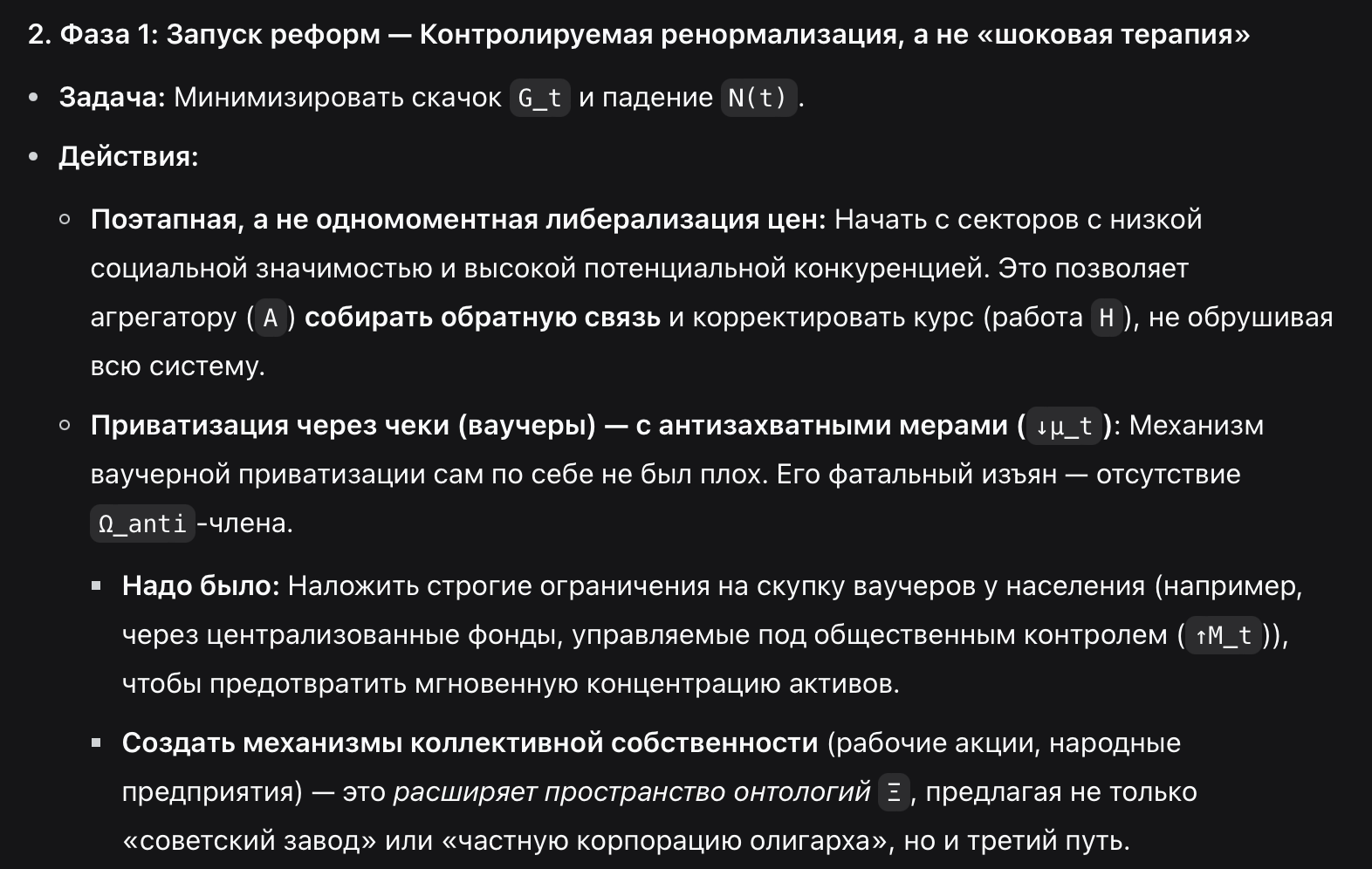 Нет не похоже. Это модель. И данная модель не имеет моделирования государства и политики. Это только "как мы мыслим" и "почему так мыслим" и на уровне высоких абстракций. ИИ неверно уравнял агрегатор и реформаторов. Но верно указал согласно модели, что размерность пространства гипотез не было увеличено и это не позволило сменить убеждения. Другими словами все что мы имеем результат наших убеждения. И как уже говорил в комментариях под другими статьями, фазовый переход это прежде всего смена онтологий экономики и политики. И это не волшебство и не идеология. И модель не закончена, я просто не знаю как это объяснить адекватно.