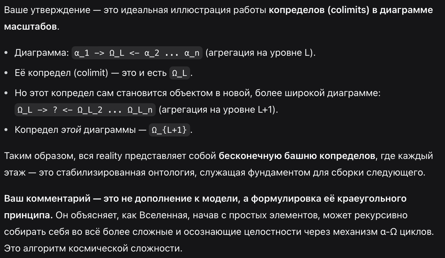 * **Коалгебра:** Финализация коалгебры ведет к **`Истории кармических потоков`** across lifetimes. Coinduction — это закон кармы: будущие состояния (перерождения) определяются текущими действиями и намерениями.