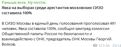 В СИЗО Москвы в единый день голосования проголосовал 491 человек. Явка составила 100%, сообщил зампред комиссии Общественной палаты России по безопасности и взаимодействию с ОНК, председатель ОНК Москвы Георгий Волков.