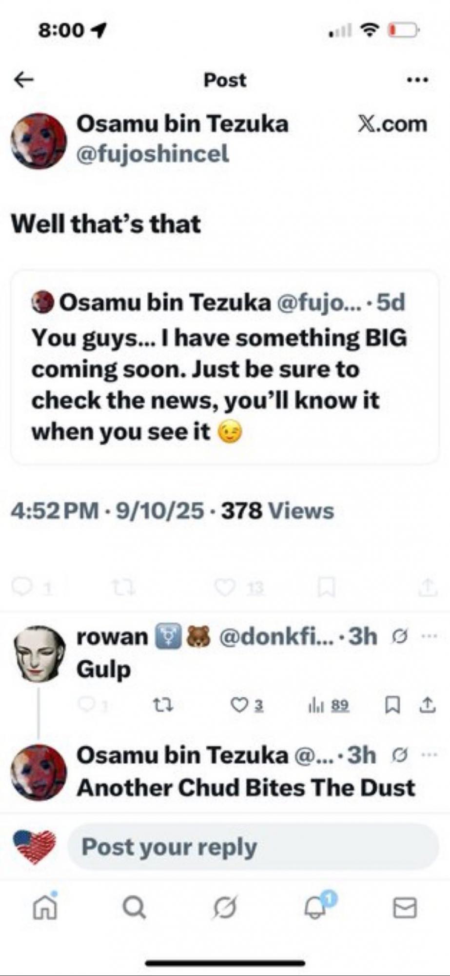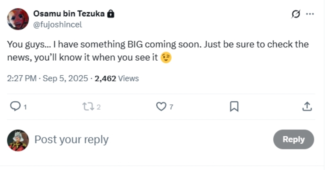 Другой аккаунт X с ником «Fujoshincel» 5 сентября опубликовал пост о том, что «скоро произойдёт что-то БОЛЬШОЕ», и призвал подписчиков следить за новостями. Пять дней спустя, вскоре после подтверждения смерти Кирка, они процитировали этот пост и написали: «Ну вот и всё», а затем добавили: «Ещё один ЧУД испустил дух».