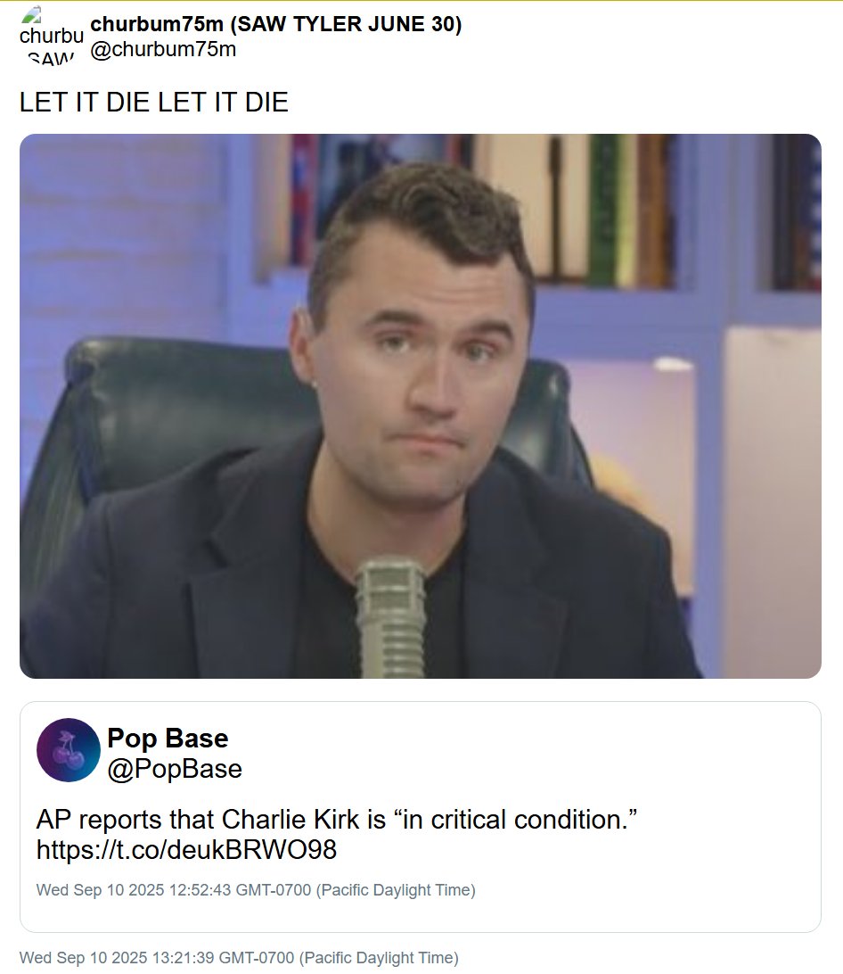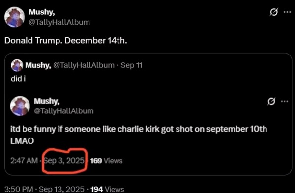 Судя по другому аккаунту, 3 сентября, когда произошло покушение на Кирка, кто-то написал: «Было бы забавно, если бы кого-то вроде Чарли Кирка подстрелили 10 сентября».