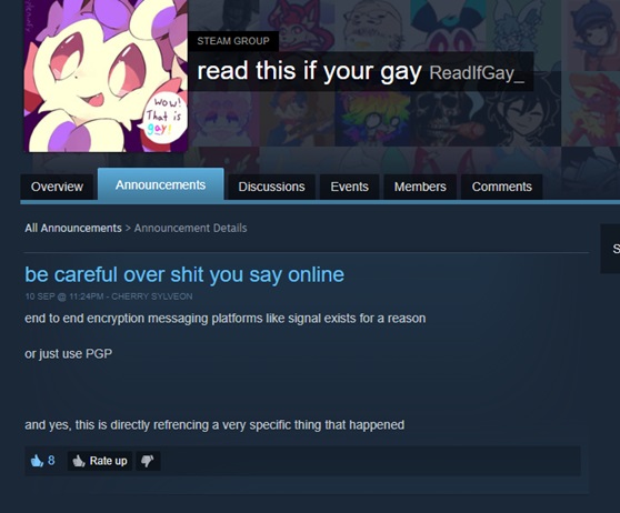 Сообщение, отправленное пользователем под ником «CHERRY SYLVEON», содержало предупреждение: «Будьте осторожны с тем, что вы говорите в мессенджерах со сквозным шифрованием, таких как Signal. Они существуют не просто так, или просто используйте PGP. И да, это прямая отсылка к очень конкретному событию».