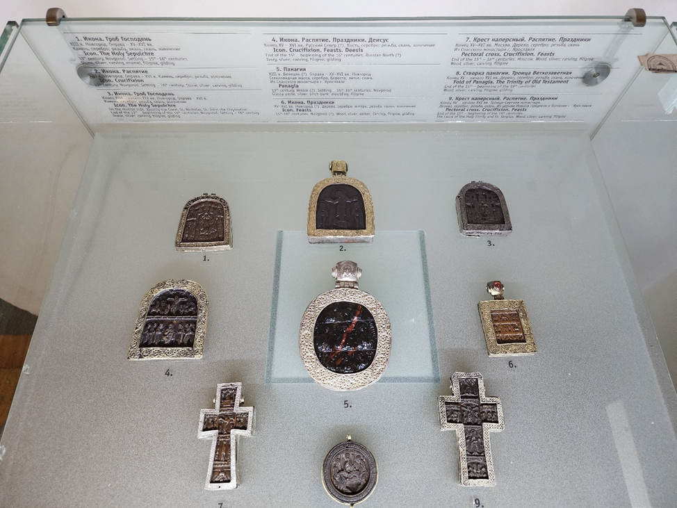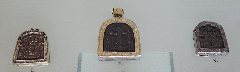 Рис.3. Нагрудные иконы, №1,2,3. Выставка «Сокровища Ярославля», Ярославский музей-заповедник. Фото автора, конец августа 2025 г.