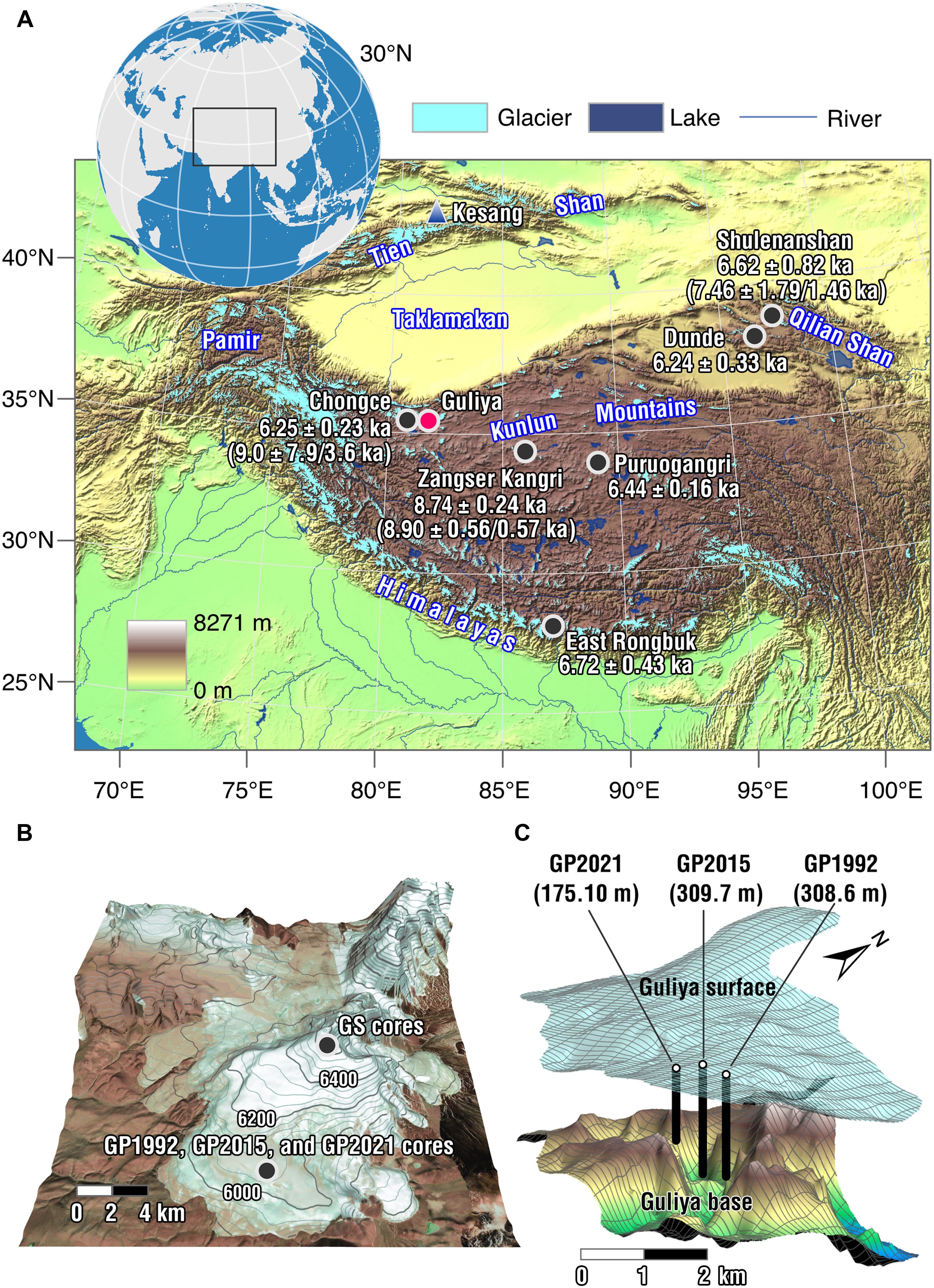 Ледяной керн Гулия (Тибет), пробуренный в 1992 году (GP1992), вызвал особый интерес из–за его исключительно длительной временной шкалы, охватывающей около 760 тысяч лет. Эта временная шкала делает GP1992 вторым по возрасту ледяным керном в мире, намного старше любого другого внеполярного ледяного керна. В этом исследовании мы пересматриваем временную шкалу GP1992, сравнивая с датировками ледяного керна Гулия (GP2021), который был пробурен в 2021 году недалеко от места бурения GP1992. Все наши данные, включая абсолютные даты, выведенные из 210Pb, 39Ar и 14C, подтвердили возраст менее 3 тысяч лет на глубине 175,1 метра GP2021 по сравнению с ~100 тысячами лет, ранее оцененными на стратиграфически эквивалентной глубине в GP1992. Наши результаты устранили несколько несоответствий между GP1992 и другими палеоклиматическими записями в регионе, что привело к появлению новых представлений об истории климата Тибетского нагорья.