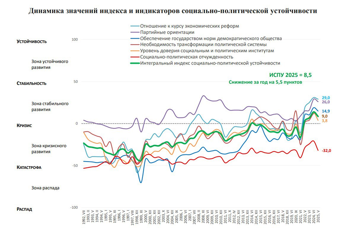 Впервые за 30 лет наблюдений, после,22 г. (❗️❗️), "Интегральный индекс социально-политической устойчивости" (ИСПУ) вышел в России из отрицательной в положительную область.