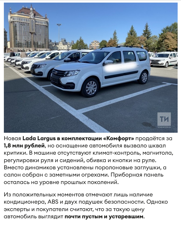 Считать положительным моментом подушку безопасности это жесть! Тогда давайте и колеса положительным моментом считать. Но, никаких вопросов бы не было, если бы ларгус продавался за цену около 1 ляма. Да нету, зато дешево. Но они ж изначально неконкурентный продукт выпускают. Не могут такую цену дать потому что в убыток? Ну дык рынок сам себя не завоюет, за демпинг слышали? Тем более на домашнем рынке у них уже вообще полный кард бланш и все убытки компенсирует г-во.
