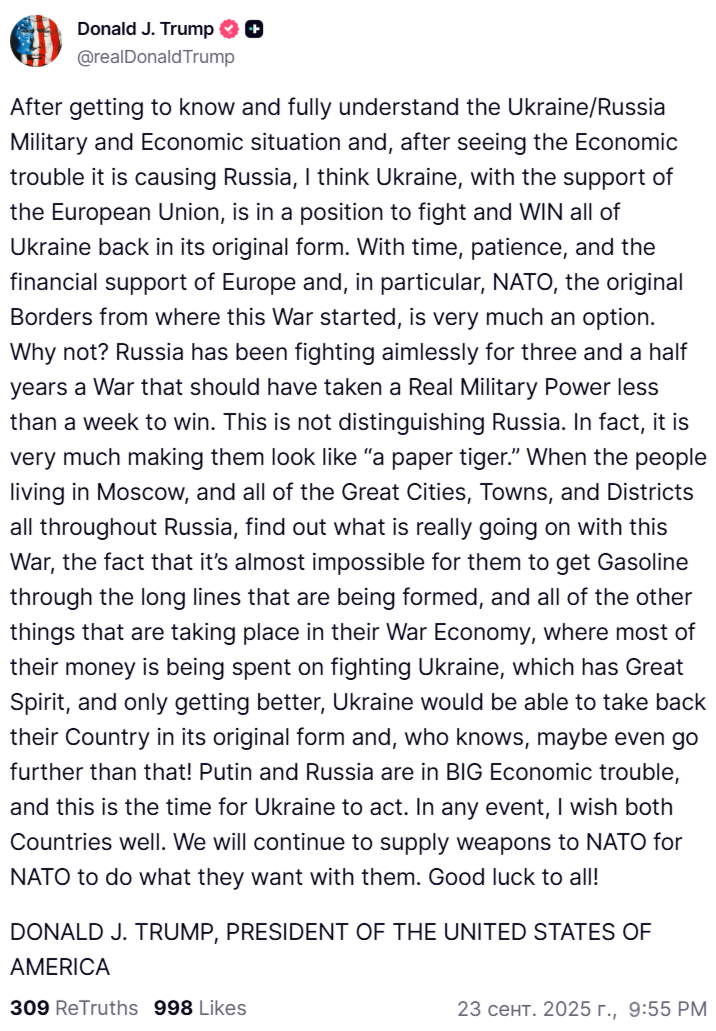 Мое же личное впечатление от заявления - Трамп просто постебался над Зеленским. Он слово в слово повторил все хотелки озвученные Зеленским за время конфликта в их максимальной форме, и пожелал удачи ему вместе с европейскими партнерами.