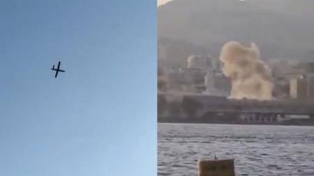 На кадрах в соцсетях видно, как дрон пролетает над курортным городом, а затем падает, и из места падения поднимается дым.