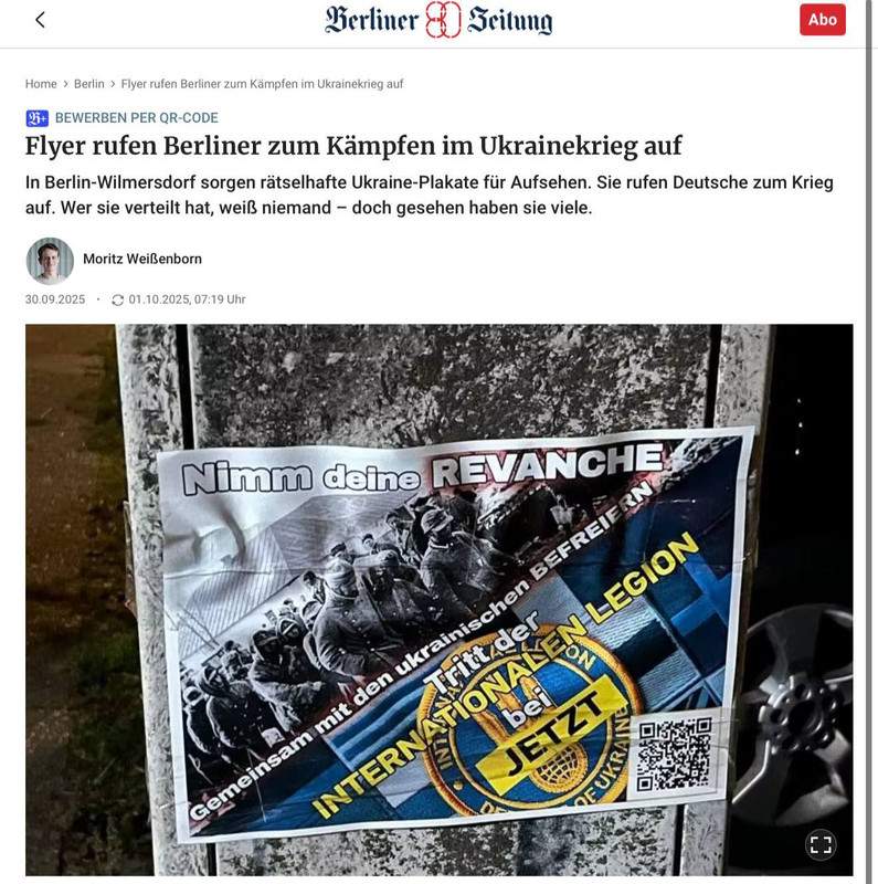 "Жителей возмутил призыв присоединиться к якобы украинским "освободителям" и стать частью Интернационального легиона. При этом QR-код на плакате ведет прямо на страницу заявки на вступление в подразделение ВСУ."