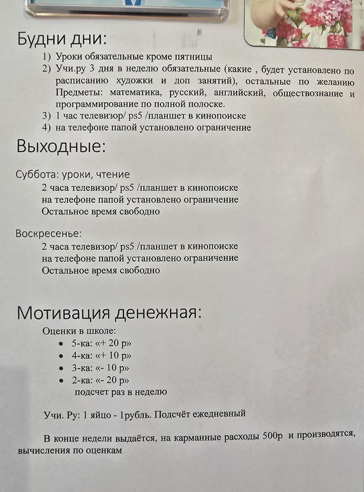 Карманные деньги: выдаем дочери 500 ₽ в неделю, плюс есть мотивация за «Учи-ру». Там начисляют баллы за прохождение того или иного задания, у нас один балл равен рублю. Сначала я очень ревностно относилась к тому, как дочь тратит деньги, потом вмешался муж: потратит все — ее проблемы. Мы не покупаем дочери игрушки. Хочешь — накопи или «заработай» на «Учи-ру».