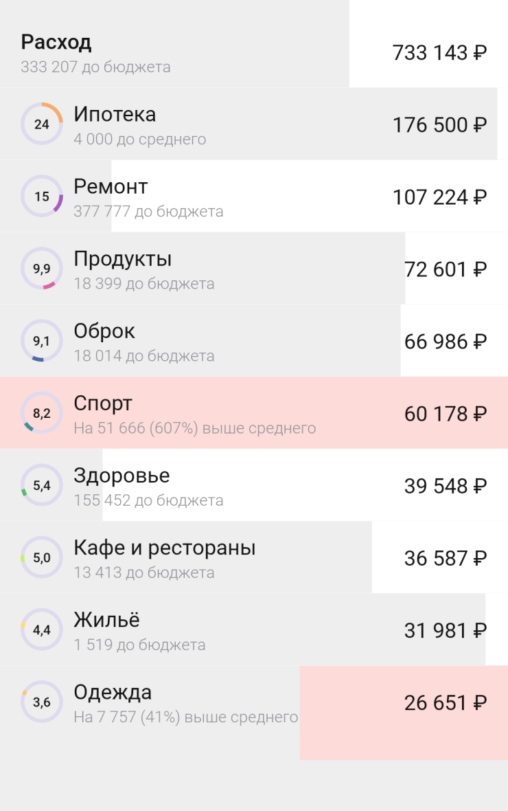 Сентябрь закончился итоговым расходом 733 144 ₽. Из планов сильно выбились траты на спорт — покупка ракетки для мужа и спортивных вещий для дочери, одежду — сказалась подготовка к родам, и на рестораны. Мы чуть больше позволили себе погулять до родов.