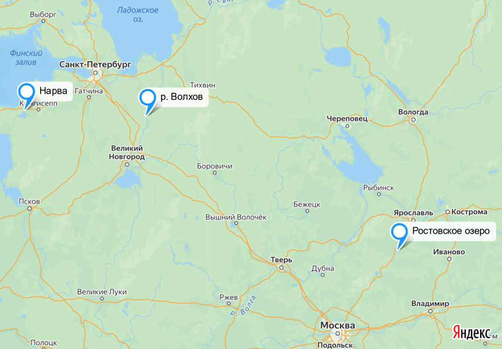 Непонятно каким образом свидетели Сиг Волховский и Лудога Нарвская были доставлены в Ростовское озеро, если реки Нарва и Волхов находятся в 600-1000 км от Ростовского озера и до 18 века не соединялись с ним непрерывным водным путем (рис.5).